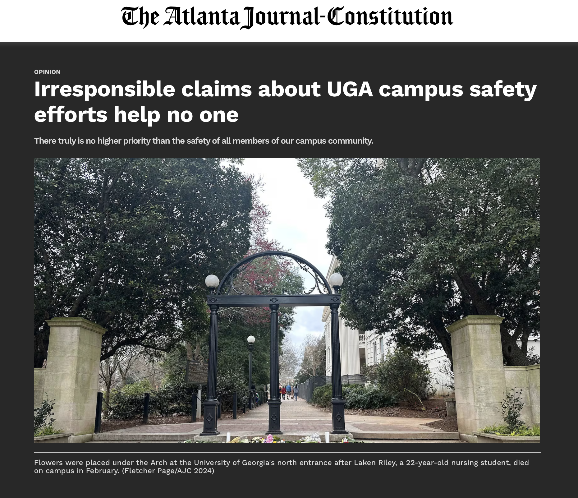 Laken Riley’s brutal murder on the University of Georgia campus was a heinous,senseless crime—one that devastated our campus community. We continue to grieve her tragic death. But for an ill-informed group to claim the crime was “100% preventable” had the university heeded its advice is not only shamefully opportunistic, it is also patently false. And it is highly disappointing that The Atlanta Journal-Constitution would spread these inaccuracies without checking the facts or giving the university an opportunity to comment. The University of Georgia is a community of more than 50,000 people that also hosts alumni and other visitors to our campus for events throughout the year. We are akin to a midsized city, and we are a microcosm of society.